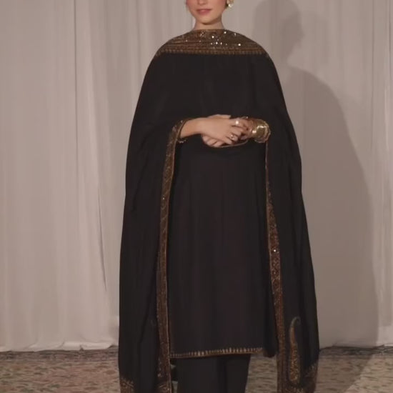 This elegant black viscose dress features intricate luxury embroidery, making it the perfect choice for a special Eid occasion. The rich fabric and stunning detailing offer a blend of comfort and sophistication, ensuring you shine with grace and style on your celebration.