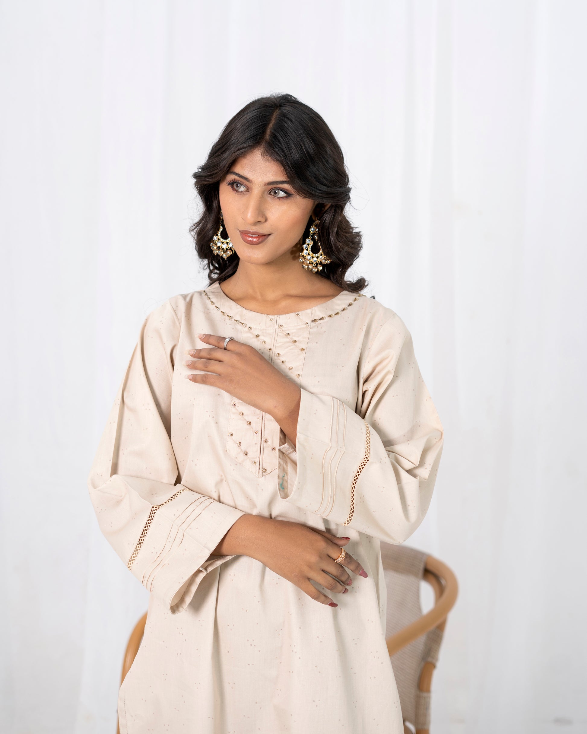Introducing the new Light Skin Dress from ZOUQ FASHION. This stunning piece combines elegance and comfort, featuring intricate design with hand work on soft cotton satin fabric. Perfectly crafted for the mid-season, it's the ideal choice for those seeking style and sophistication in one beautiful outfit.