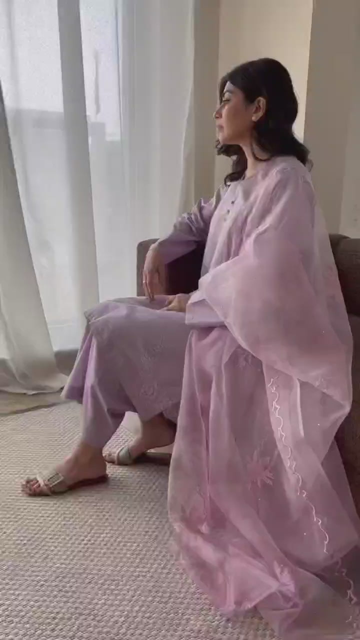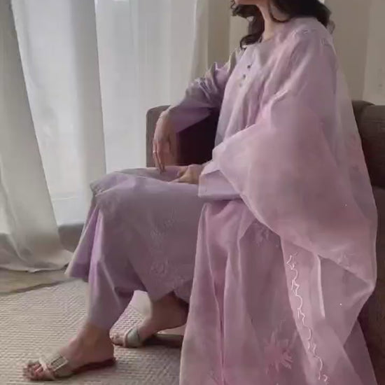 Paired with an ethereal Organza Dupatta, this ensemble is complete with fine embroidery that enhances the overall charm and grace. The organza fabric adds a layer of refinement, flowing gently to create a perfect balance of beauty and luxury. The rich purple hue enhances the design, making it ideal for festive occasions, weddings, or formal gatherings.