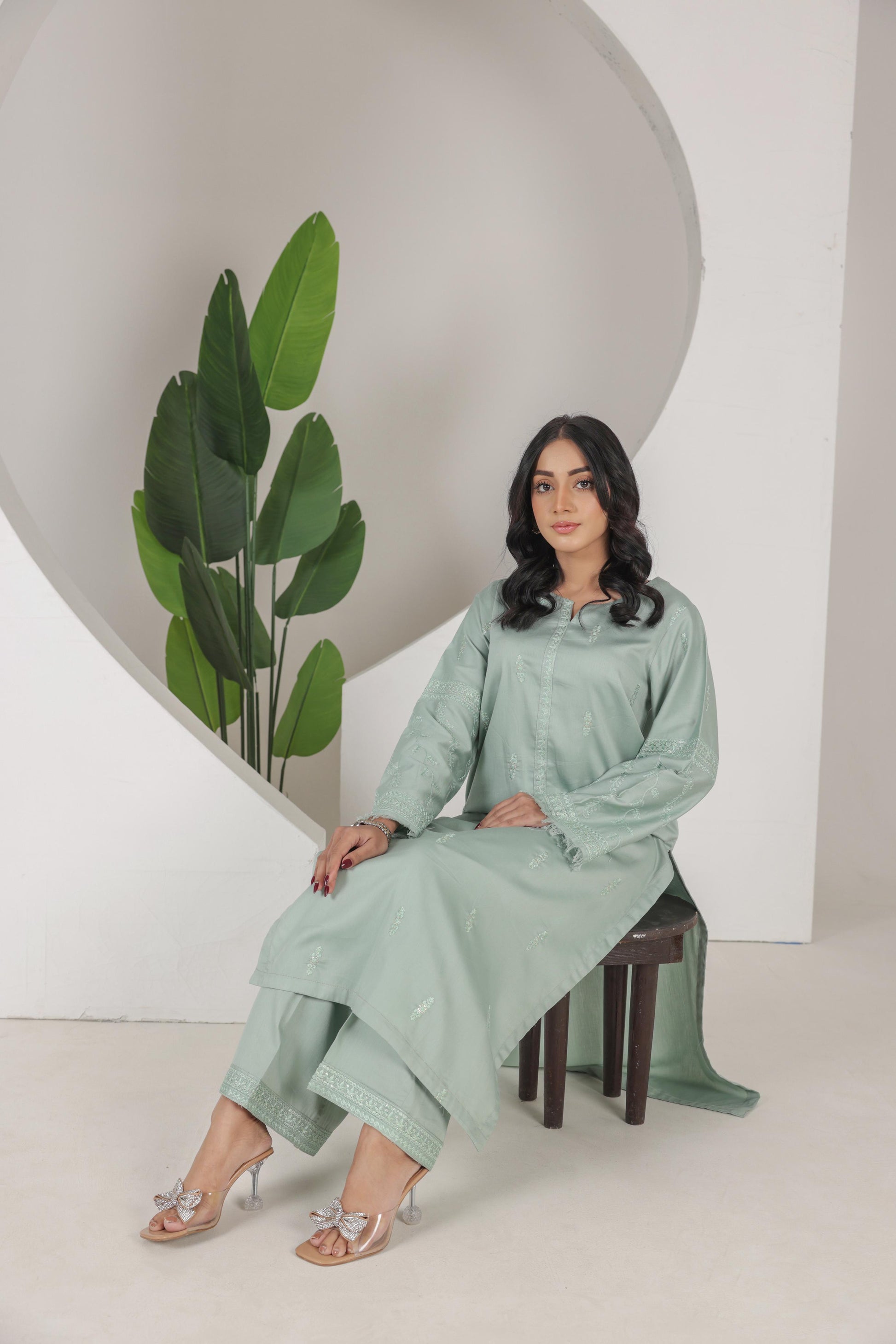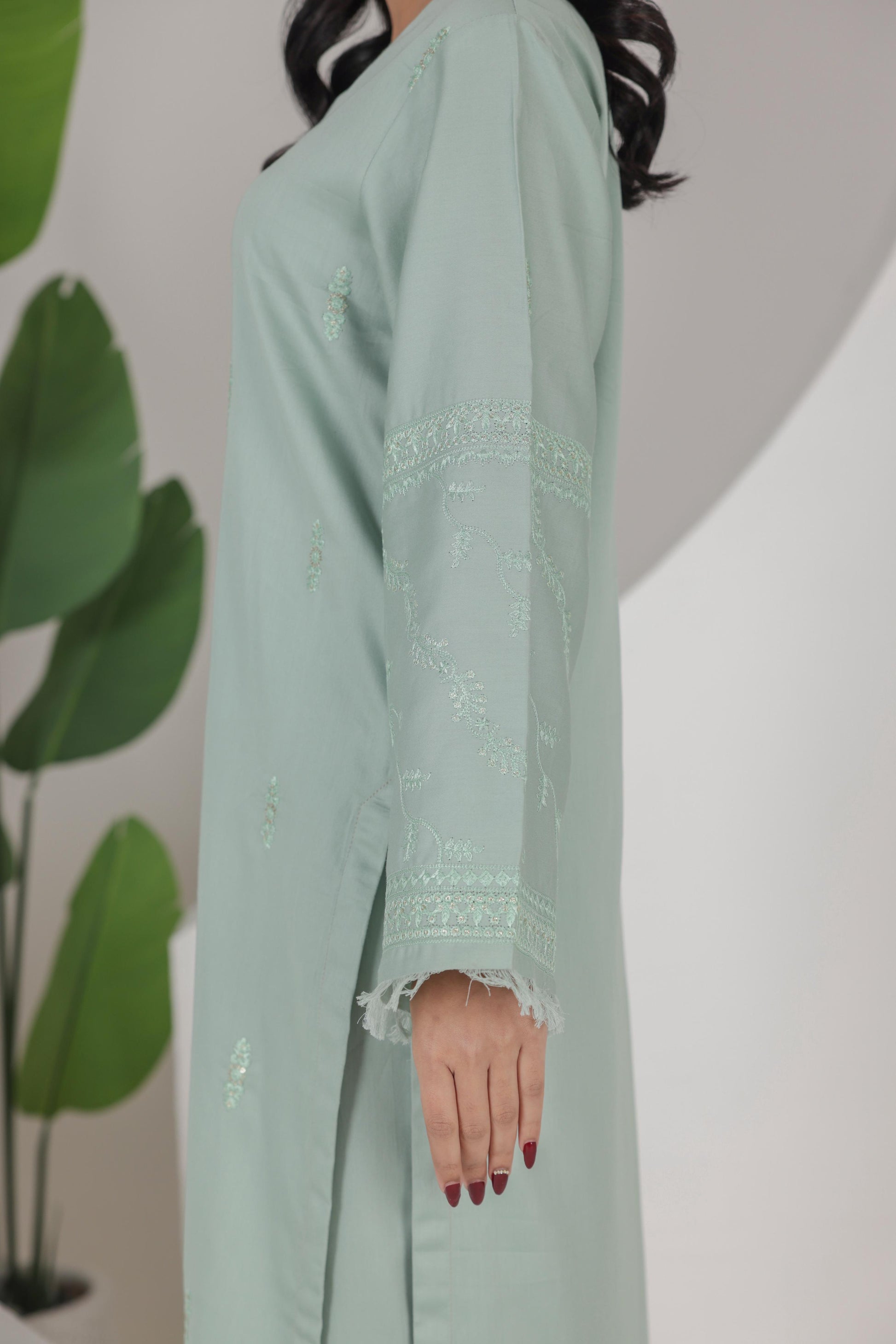 The shirt features a graceful silhouette with embroidery, while the straight-cut trousers provide a chic and contemporary finish having an antique and elegant embroidery. The satin fabric exudes a subtle sheen, adding a touch of glamour and comfy to your ensemble.