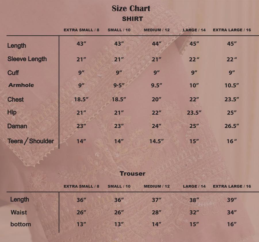 Elegant Rosy Vintage 3-piece with intricate golden embroidery and sequin details. Coordinated straight-cut trousers with matching embroidery. Lightweight dupatta with subtle golden accents.