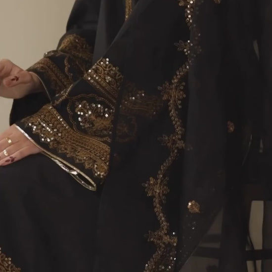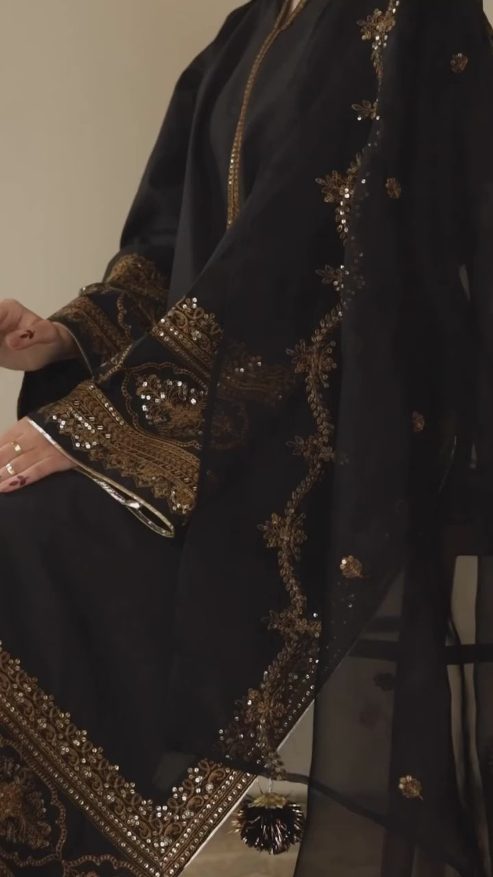 Complete your look with traditional khussas and gold accessories to exude a truly majestic aura. Step into luxury and embrace timeless beauty with "Siyaah Embroided Dress".