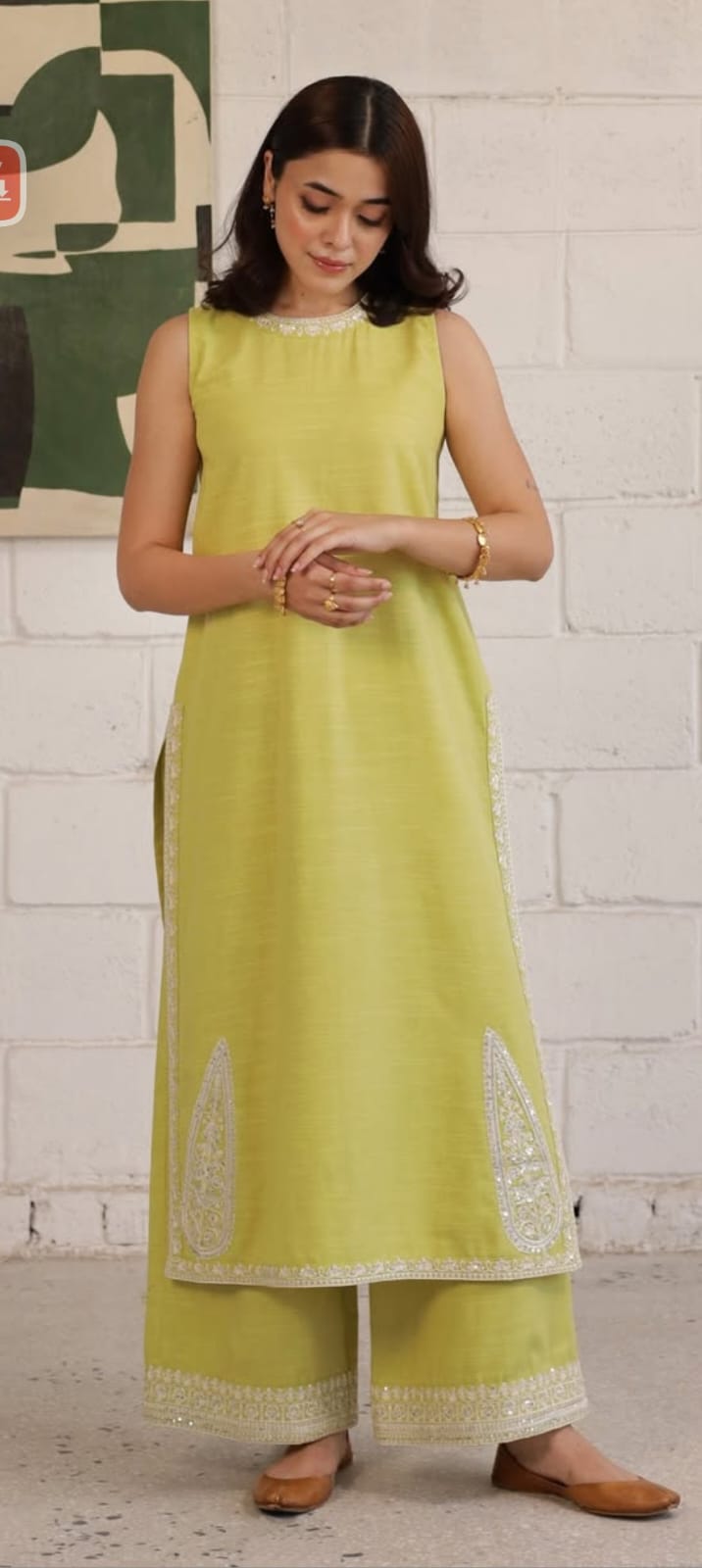 :Embroidered Long Shirt & Embroidered Straight Touser With Contrast Finishing