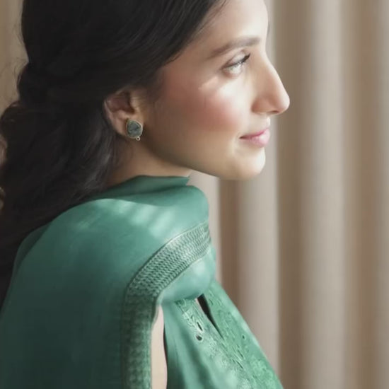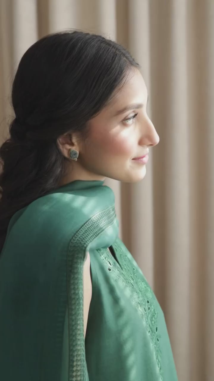 To complete the look, the Organza dupatta is dyed in rich green tones, soft and fluid, adding movement and grace without overpowering the minimal elegance of the design.